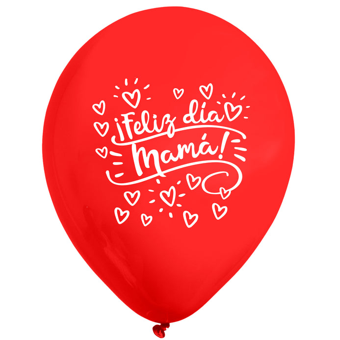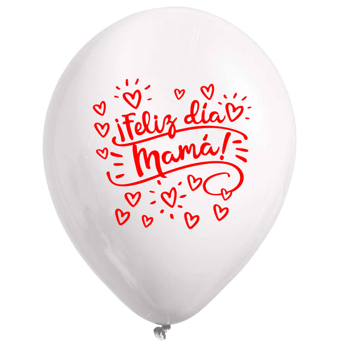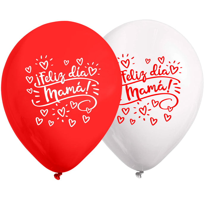 Globos Látex Biodegradables Feliz Día Mamá Blanco y Rojo