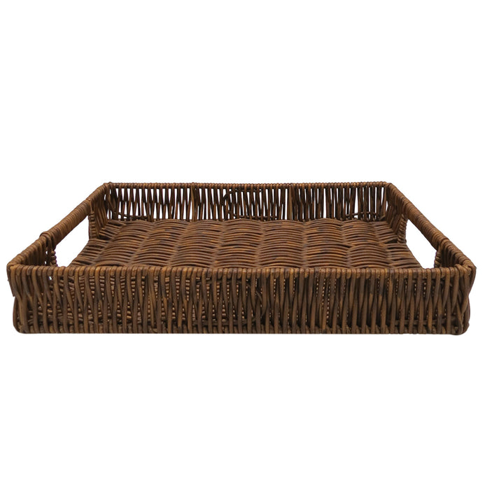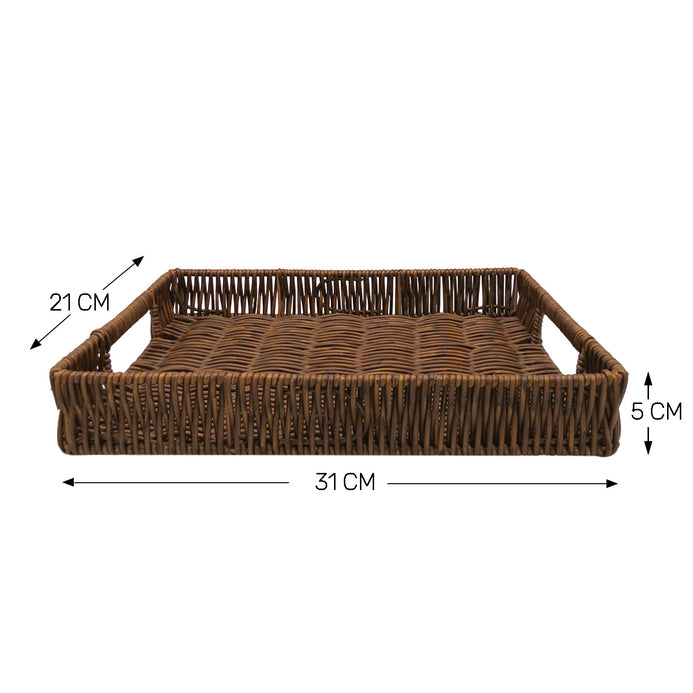 Bandeja hecha de mimbre y forrada con cuerda, tiene dos asas a los lados para su manejo. Tiene un diseño muy elegante y diferente a las bandejas clásicas, gracias a la combinación de los diferentes materiales usados. Es resistente y de gran capacidad de almacenaje. Ideal para usar en el hogar para colocar fruta o accesorios, incluso para uso en comercios que exponen sus productos al público como fruterías, pastelerías o panaderías.