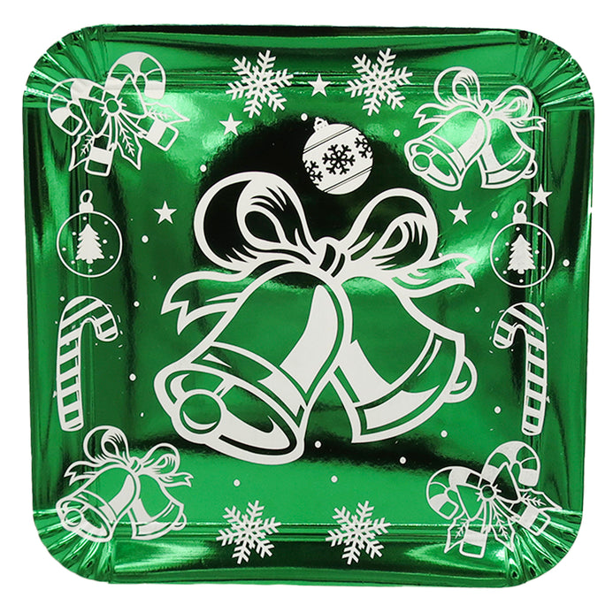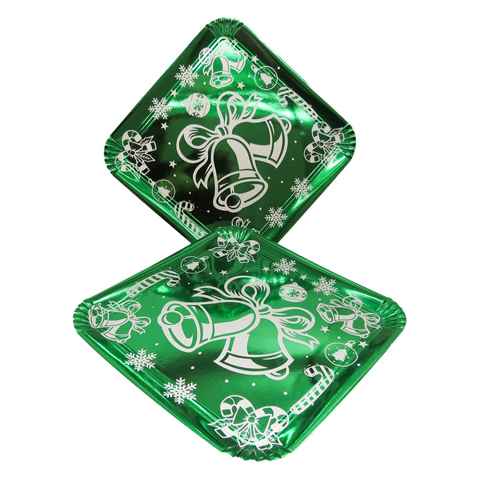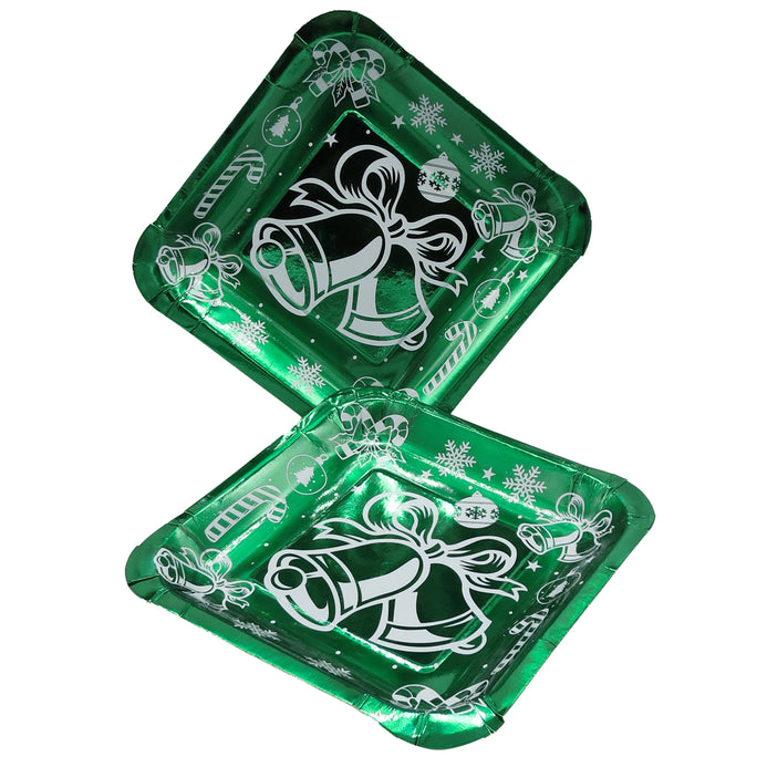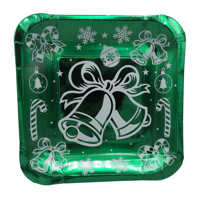 Plato cartón Cuadrado Metalizado Navidad Verde Campanas x12