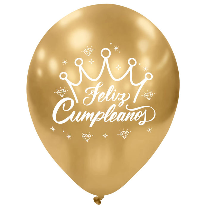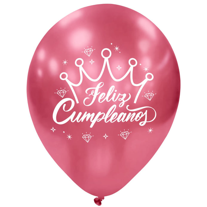 Globos Látex Biodegradables Espejo Cromado Feliz Cumpleaños Dorado y Fucsia