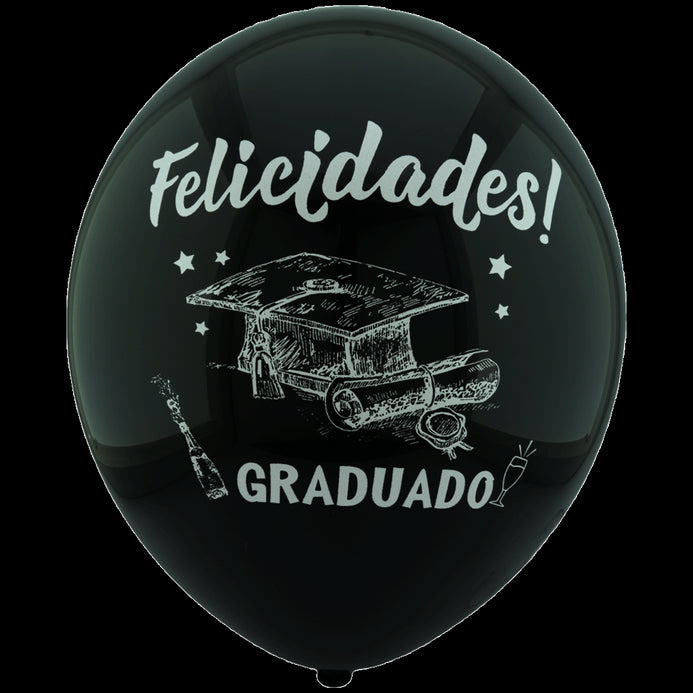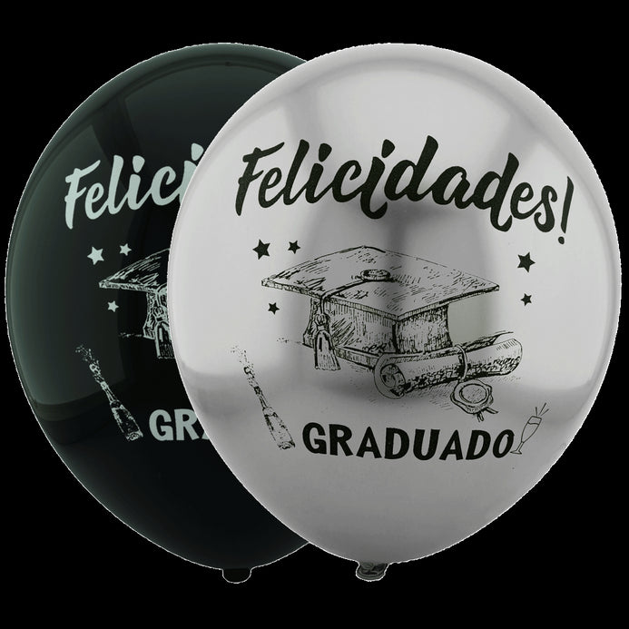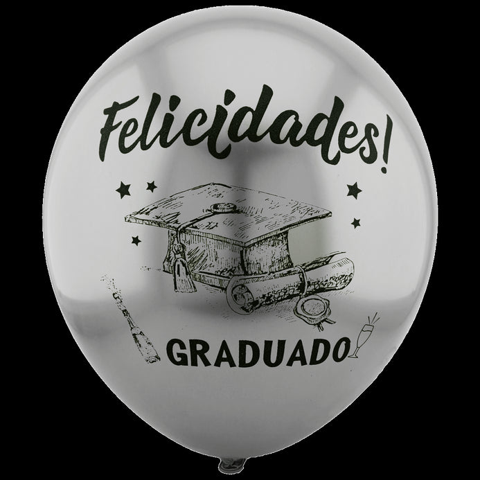 Globos Látex Biodegradables Espejo Satinado Felicidades Graduado Plata y Negro