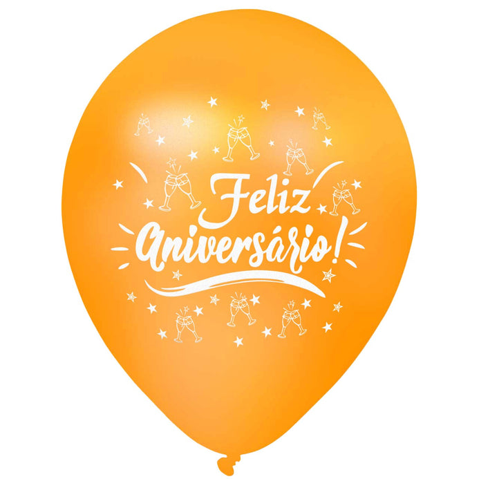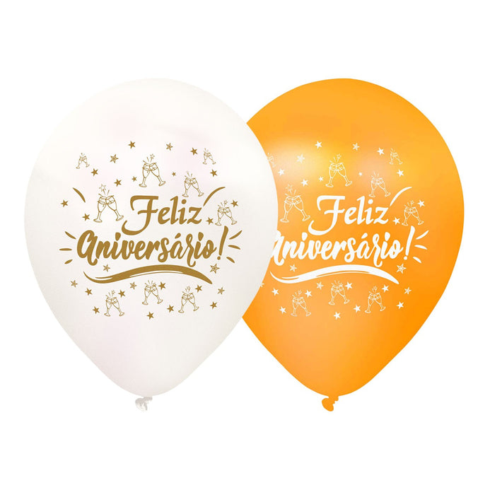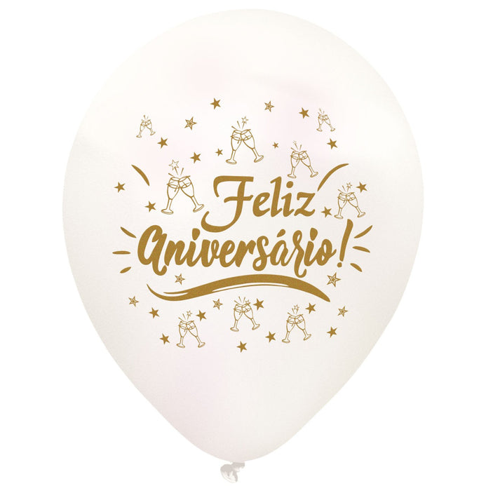 Globos Látex Biodegradables Satinados Feliz Aniversario Blanco y Dorado