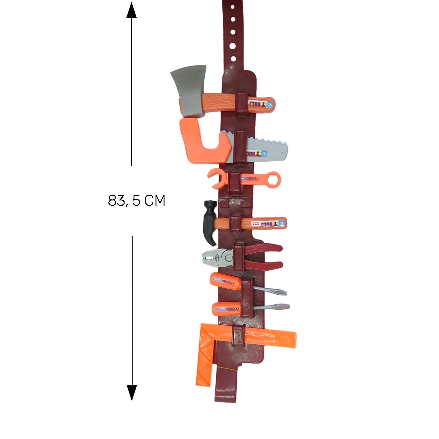 El set consta de 10 piezas en total: Casco, cinturón, llave p/ tuercas, serrucho, llave de caño, llave Stilson, destornillador Philips, martillo, pinza y llave inglesa.