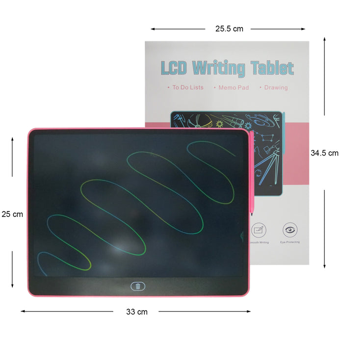 Tableta de escritura LCD colorida de 33 cm Largo por 25 cm ancho, para niños y niñas es un juguete creativo de educación y aprendizaje, soporte perfecto para dibujar, escribir, ortografía, matemáticas, comentarios y notas que pueden permitir que tus hijos liberen libremente sus instintos naturales. Con botón de borrado en la parte delantera e interruptor de bloqueo. Puedes dibujar y borrar fácilmente presionando el botón en la parte frontal del tablero. El bolígrafo se ajusta cómodamente en la parte superior de la tableta y no se afloja.