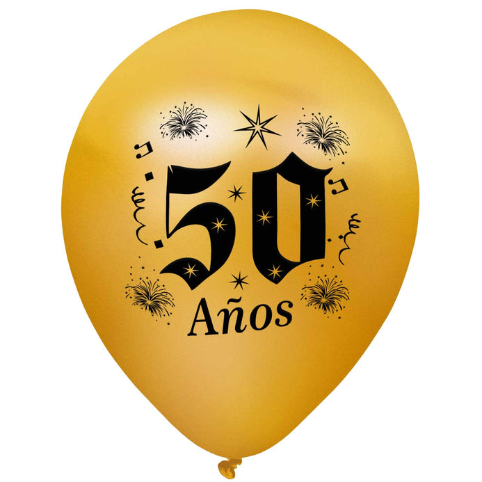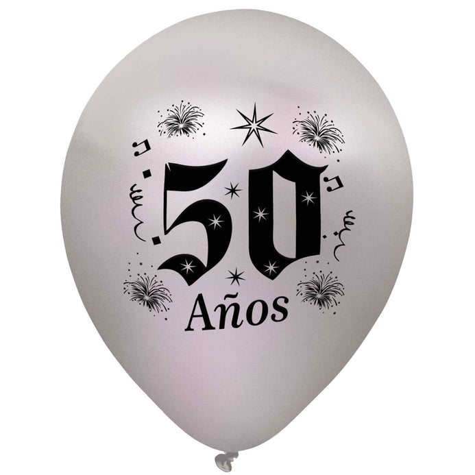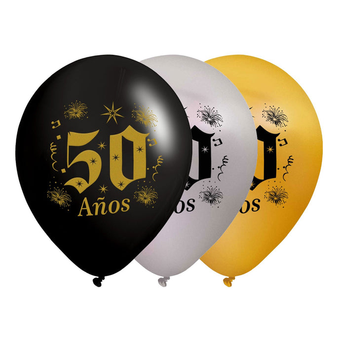 Globos Látex Biodegradables Satinado 50 Años Negro-Dorado y Plata