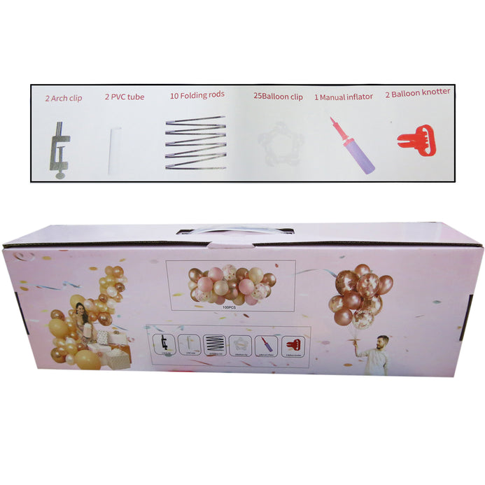 Paquete: Caja Contiene: 2 Prensas / 2 tubos Pvc /10 varillas plegables / 25 clip para globo 1 inflador manual / 2 arreadores de globos.