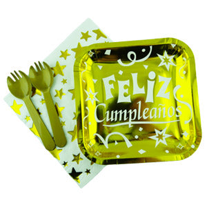Kit (Cubiertos-Platos-Servilletas) Metalizados Feliz Cumpleaños